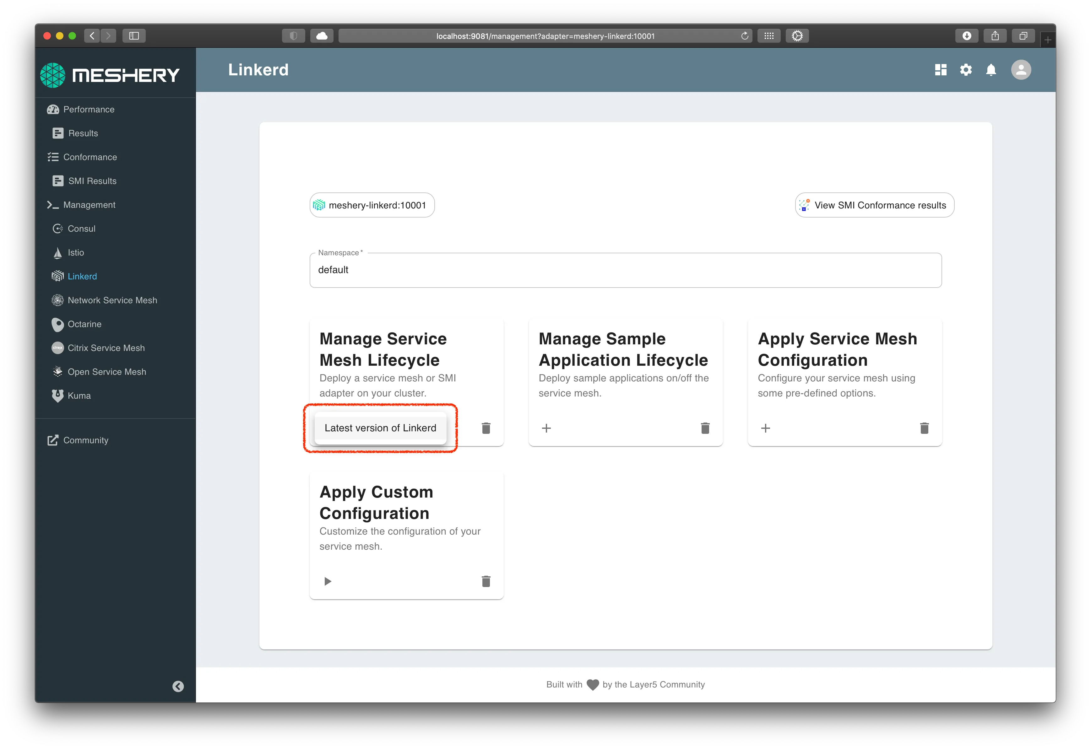 Now that we have a Kubernetes cluster and Meshery, we are ready to download and deploy Linkerd resources.